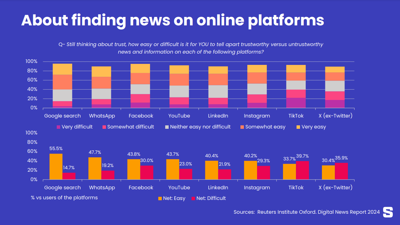 On n’a évidemment pas fini de commenter l’annonce faite par Marc Zuckerberg sur la suppression du fact-checking chez META. Mais ce buzz mondial nous donne l’occasion de revenir sur une analyse réalisée à partir des données du Digital News Report (DNR) de l’Institut Reuters de l’Université d’Oxford. Une question du DNR édition 2024 posée par rapport à différentes plateformes (dont Google Search, qui n’a rien d’un réseau social) aborde spécifiquement la fiabilité perçue pour chacune d’entre elles : “Toujours en rapport avec la confiance, dans quelle mesure est-il pour VOUS facile ou difficile de distinguer l’information fiable de celle qui ne l’est pas sur chacune des plateformes suivantes ?”.
