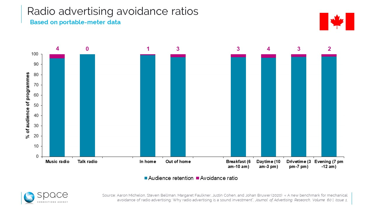 Ainsi, le contraste entre radios musicales (taux de zapping proportionnellement plus élevé) et radios “talk” (ratio négligeable) s’expliquerait par une cassure plus nette entre programmation et pub, laquelle est souvent parlée, dans le flux des musicales. Le taux un peu plus élevé du zapping hors du foyer s’expliquerait lui par une plus grande facilité de switch de station en voiture qu’à la maison. Quant à la variation par tranche horaire, les rédacteurs de l’article la relient à la proportion de “light listeners” à l’écoute : significativement plus faible en soirée, la proportion de petits consommateurs radio y est corrélée à un taux de zapping (2%) inférieur à celui des autres tranches horaires.