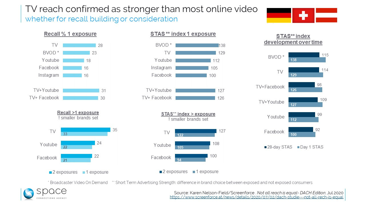 “Not all reach is equal”. C’est sous ce titre que, lors d’une media session CommPass, l’académique australienne Karen Nelson-Field était venue montrer, chiffres à l’appui, une capacité supérieure de la publicité TV à soutenir les ventes des marques, dans une proportion bien supérieure à celle de la vidéo en ligne. Cette étude vient de connaître un prolongement, pratiqué sur la zone DACH (Allemagne, Autriche et Suisse). Un prolongement plutôt sérieux, effectué sur un panel de 2.500 répondants, dont 80% d’Allemands. Et une étude enrichie : les résultats incluent maintenant la vidéo sur Instagram et tiennent compte de fréquences d’exposition supérieures à un.