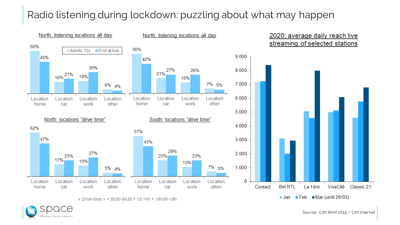 L’étude Radio Audience Measurement (RAM) du CIM nous apprend qu’en 2019, les actifs professionnels attribuaient environ 25% de leur volume d’écoute à leur autoradio : cette partie-là de l’audience s’est très certainement réduite, et fortement. Les données de géolocalisation des smartphones ont en effet révélé que nos déplacements ont diminué de 54% en période de confinement, et que les longs trajets (plus de 40 km hors du code postal du domicile) ont quasi disparu (-95% !). Ne parlons pas de l’écoute sur le lieu de travail : elle aussi doit s’être très considérablement réduite, sauf peut-être pour ceux qui travaillaient déjà à domicile. Le domicile, parlons-en : en 2019, même pour les individus professionnellement actifs, il constituait précisément le lieu d’écoute le plus important… Un report des écoutes en situation de mobilité, ou au travail, vers le domicile ne peut donc pas être exclu… mais rien non plus ne le prouve.