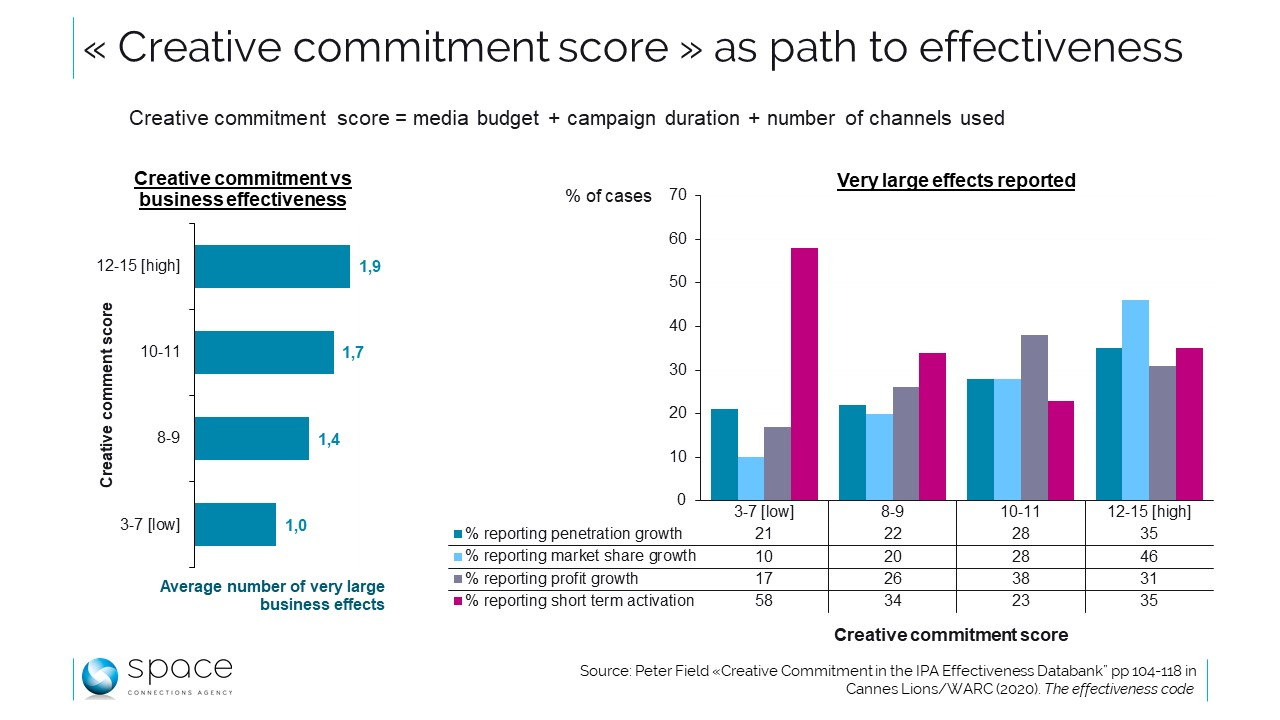 Ses auteurs, James Hurman et Peter Field ont analysé des centaines de dossiers soumis dans le cadre de prix d’efficacité publicitaire. Ils y définissent une métrique assez simple : le Creative Commitment Score (CCS). Lequel cumule trois éléments parfaitement maîtrisables et objectivables : le budget média de la campagne, sa durée exprimée en mois, voire années (!) et le nombre de canaux différents utilisés. Chacun de ces éléments est noté de 1 à 5, et le score d’engagement créatif qui en résulte est donc compris entre 3 et 15.