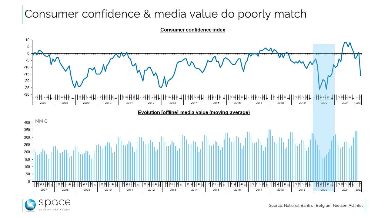 Pour être plus précis, quand le consommateur belge a le moral dans les chaussettes, est-ce que cette dépression affecte plus ou moins rapidement la valeur des investissements médias ? Le moment est opportun en effet, puisque les derniers résultats du baromètre de confiance des consommateurs viennent de faire un plongeon assez spectaculaire.