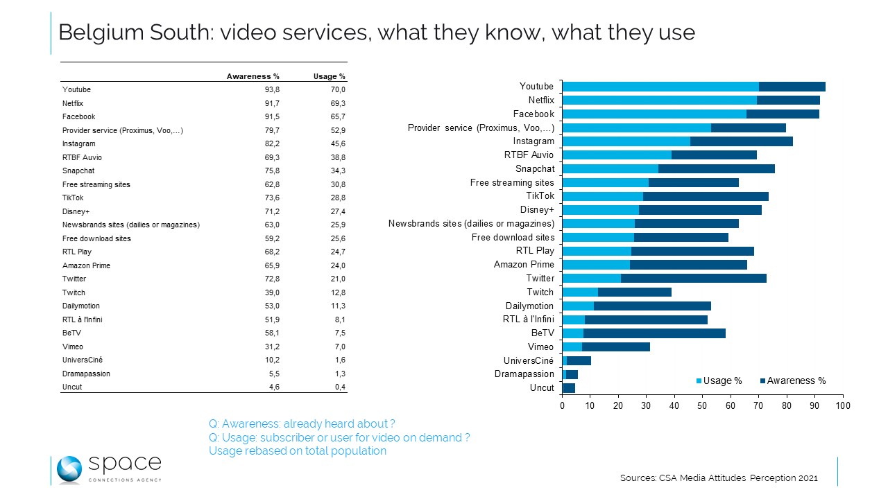 Les 380 (!) pages du rapport publié contiennent une masse d’information sur la consommation vidéo de la population du Sud du pays. Parmi ces données, deux questions sur les services de vidéo à la demande présentent un intérêt double : d’abord elles portent sur un large spectre d’offres qu’on n’aurait peut-être pas spontanément associées dans un même questionnaire, ensuite elles distinguent notoriété (“Voici une liste de services, pour chacun d’entre eux pouvez-vous me dire si vous en avez déjà entendu parler ?”) et utilisation (“Êtes-vous abonné ou l’utilisez-vous pour regarder des vidéos à la demande ?”). Recalculée par rapport aux répondants à la première question (soit 1.249 individus), la valeur relative à l’utilisation permet aussi d’établir un ratio de conversion, soit le rapport entre connaissance et usage effectif déclaré.