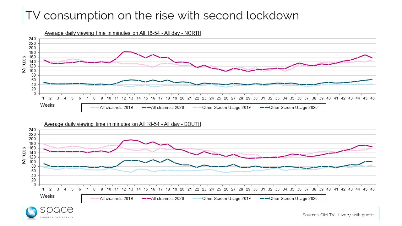 Mais n’oublions pas que ce second confinement est moins strict que le premier. En ce début du mois de novembre, on n’est pas loin de 4 heures de télévision en moyenne par jour pour les 18-54 ans dans le Nord du pays, et 4 heures et demie dans le Sud (total screen usage). Sachant que tout le monde ne regarde pas la TV tous les jours, mais bien environ 75% des 18-54 ans actuellement, la durée de vision moyenne de ceux qui allument effectivement la télévision est, ces dernière semaines, de 5 heures dans le Nord et 6 heures dans le Sud. Ces chiffres très conséquents sont en nette progression par rapport à ceux de 2019, même si les écarts sont moins spectaculaires qu’au printemps.