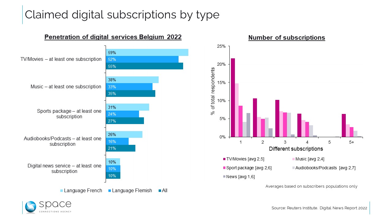 C’est ainsi qu’en 2022, sous le thème “subscriptions fatigue”, les répondants ont été sondés sur leurs abonnements à différents services digitaux. Ceux liés à l’information bien sûr, mais aussi au divertissement : streaming vidéo (Netflix, Amazon Prime Video, Disney+, etc.), musique (Spotify, Apple Music, Deezer, etc.), packages sportifs (Sky Sports, BT Sports, etc.) et audio (avec les exemples Audible, Curio, etc.). D’où une comparaison entre la popularité (déclarée) des différents types d’offres.