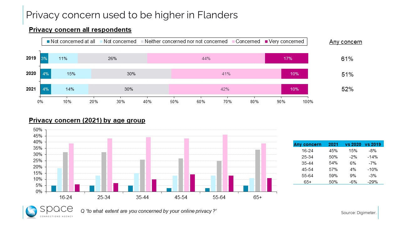 Le commentaire d’Imec – auteur de l’étude – pointe une forte augmentation du souci de privacy chez les plus jeunes par rapport à l’année dernière. C’est juste mais un peu court : on voit en effet que la préoccupation était plus forte en 2019, et qu’elle semble s’être tassée depuis : chez les moins de 25 ans, les propositions « très préoccupé » et « préoccupé » réunissaient alors 49% des sondés, les 45% d’aujourd’hui sont donc en-deçà. Derrière l’apparente stabilité, ou derrière une évolution comme celle des 16-24 ans, il y a donc encore une différence marquée par rapport aux tout premiers résultats en la matière.