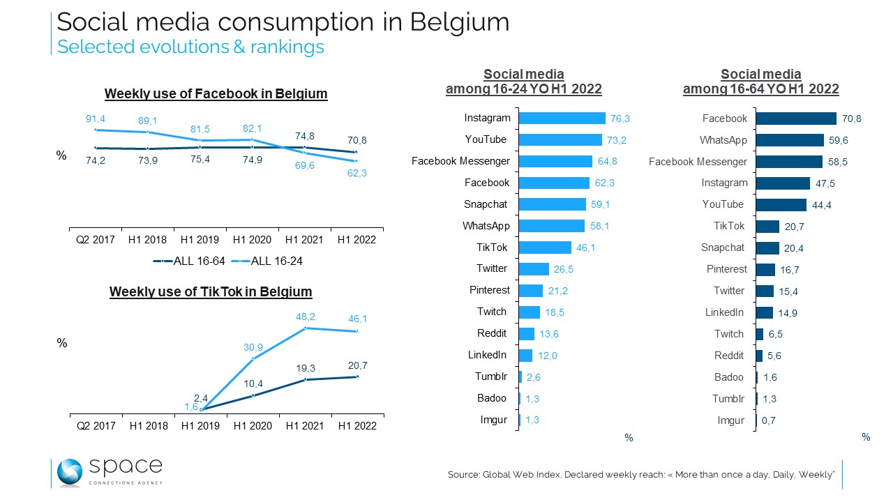 Bref, dans l’univers étudié, le temps n’est plus à la croissance débridée. Ceci étant, les moins de 25 ans restent – de loin – les plus gros utilisateurs de médias sociaux. Au cours de ce premier semestre 2022, les Belges de 16 à 24 déclaraient utiliser plus de 5 marques au cours d’une semaine moyenne, contre 4 chez les 25-34 ans et moins de 3 chez les 55-64 ans. Moins fréquents sans doute, plus matures peut-être, mais toujours heavy users de médias sociaux, les jeunes adultes de notre plat pays restent en gros conformes à leur image.