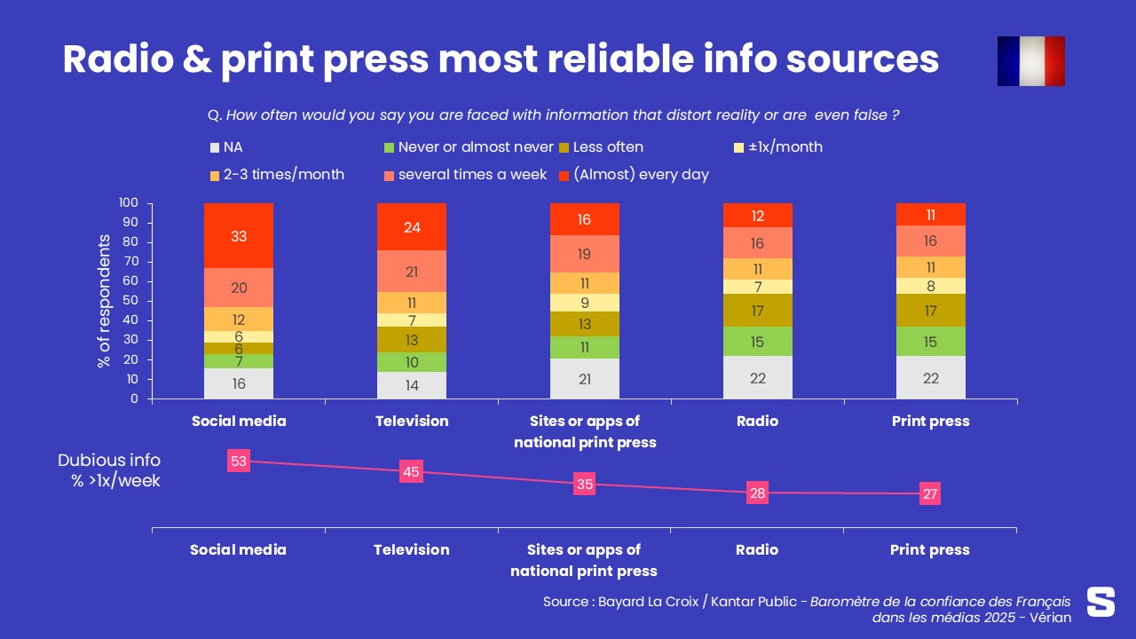 Selon les 1.500 répondants français âgés d’au moins 18 ans interrogés en novembre dernier, les “fake news” ou assimilées (on parle « d’informations qui déforment la réalité ou qui sont même fausses ») se retrouvent le plus souvent dans les médias sociaux : 53% des répondants disent y être confrontés chaque semaine, contre 45% en télévision. La part d’information perçue comme douteuse se réduit sensiblement en radio et en presse écrite. Ceci étant, même là, un peu plus d’un répondant sur quatre déclare quand même se retrouver face à des fake news dans ces deux médias.