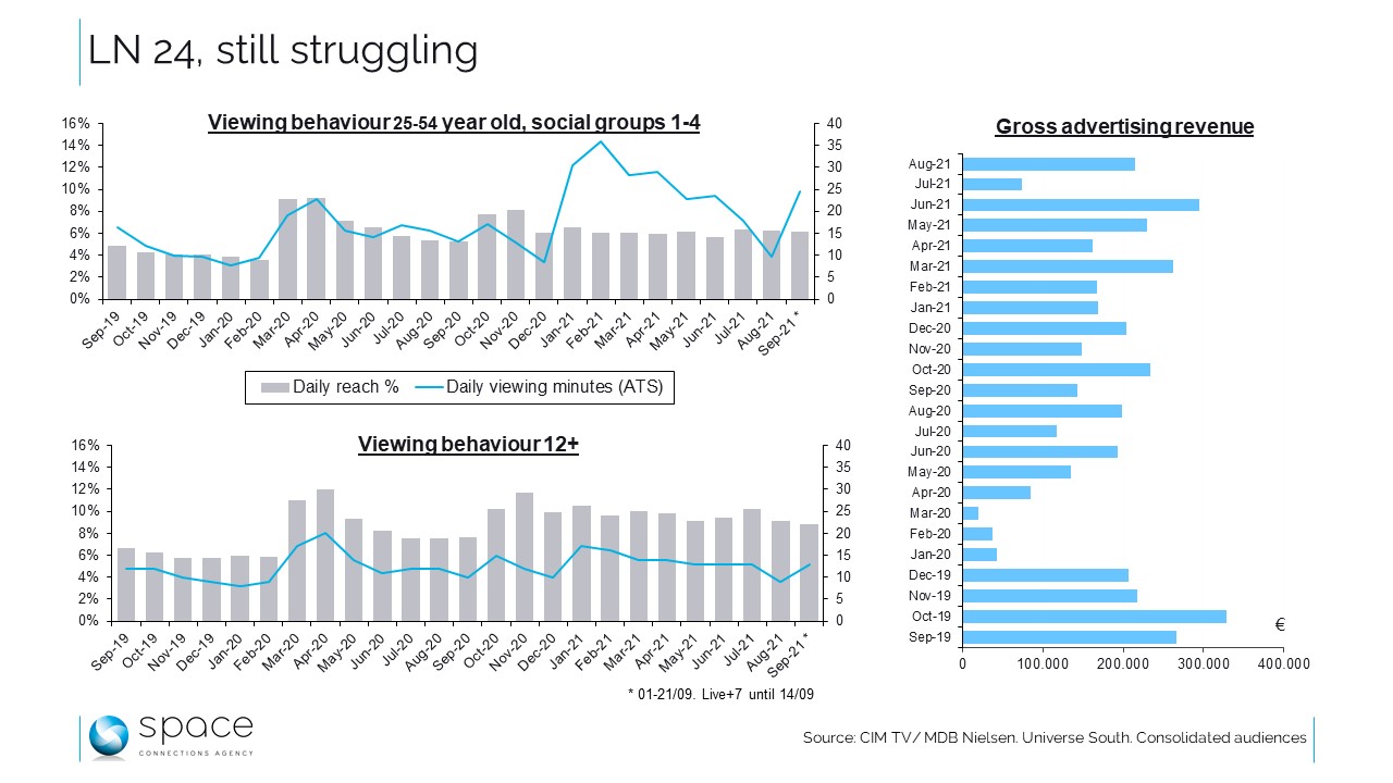On le sait, LN24 a “bénéficié” de l’effet Covid en 2020, en deux fois d’ailleurs : une première avec le “lockdown épisode 1” au printemps et une seconde en fin d’année (“lockdown épisode 2″…). Depuis, il faut bien dire que l’impact Covid s’est étiolé. Sur son coeur de cible, 25-54 ans des groupes sociaux supérieurs, LN24 parvient à optimiser son temps de consommation : 18 minutes par jour sur l’ensemble de la période contre 13 minutes sur l’ensemble de la population du Sud du pays. Mais ce temps de vision des spectateurs (ATS) ne représente donc qu’un gros quart d’heure. Signe de la volatilité de la consommation de cette chaîne, l’audience journalière cumulée “daily reach” sur le coeur de cible est à 6% en moyenne, mais tombe à un très maigre niveau (1,5%) lorsqu’on introduit un seuil de vision de 10 minutes… Le sommet sur ce plan a été atteint en avril 2020, avec un daily reach à 3,8%. Un public de niche donc, pour lequel l’évolution n’est pas franchement orientée à la hausse. En termes de revenus publicitaires, les valeurs restent également limitées : LN24 pèse 0,4% du total brut de la publicité télévisée Sud sur le premier semestre 2021, ce qui est mieux que les 0,3% de moyenne en 2020, mais demeure évidemment modeste.