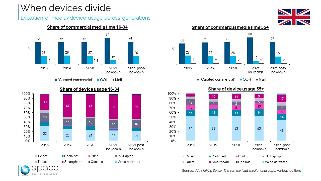 Une grande partie du contenu de “Making sense” tourne autour des différences entre générations, avec une analyse parallèle des moins de 35 ans, de la tranche intermédiaire 35-54 ans et puis de celle des 55 ans et plus. Si l’on compare les deux extrêmes, la part du temps consacré aux différents canaux commerciaux y est assez semblable : forte poussée de la part du “curated commercial” durant le lockdown, puis retour à une forme de normalité. Au passage, cela permet d’insister sur le côté fédérateur de la pub extérieure : quelles que soient les générations, elle occupe environ un quart du temps média “commercial”.