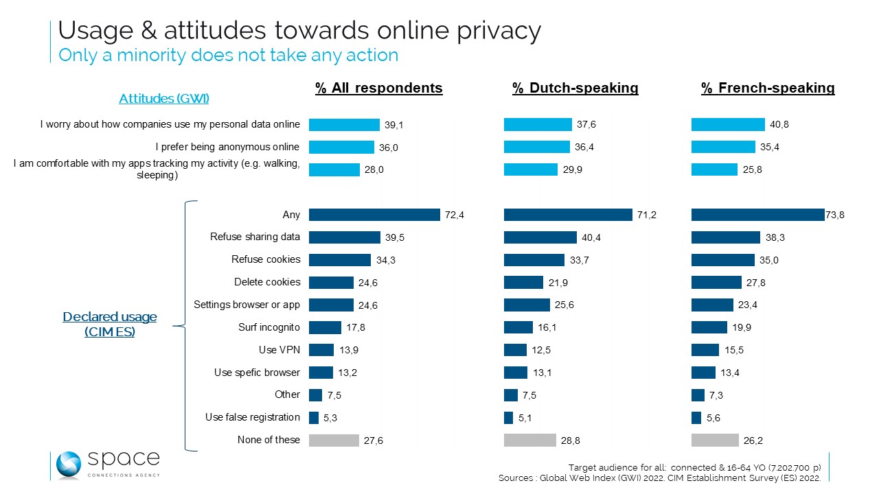 Or, le CIM nous apprend que 72% des individus répondant aux mêmes caractéristiques disent avoir pris au moins une action préventive en termes de “privacy” en ligne. Ces actions sont de différents ordres, mais les trois principales sont refus de partage de données, refus des cookies ou destruction de ceux-ci. L’adaptation des paramètres de confidentialité sur les navigateurs et applications vient ensuite, suivie par la navigation privée, l’utilisation d’un VPN, celle d’un navigateur spécifique ou d’autres moyens (sans plus de spécification).