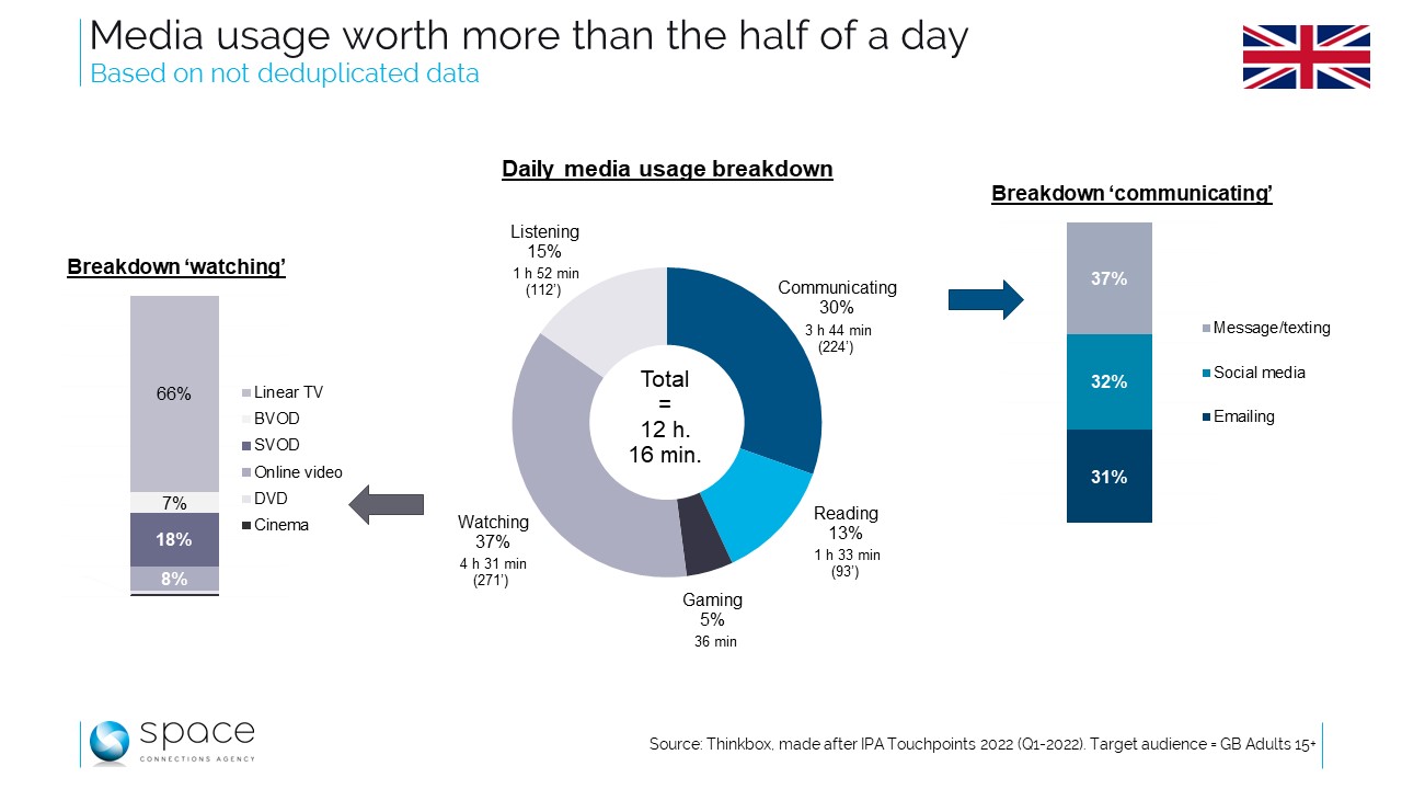 Si on en croit l’étude Touchpoints réalisée en Grande-Bretagne, relayée par Thinkbox, les ressortissants britanniques âgés d’au moins 15 ans cumulent 12 heures et 16 minutes de consommation média par jour. Une valeur qu’il faut absolument mettre en perspective.