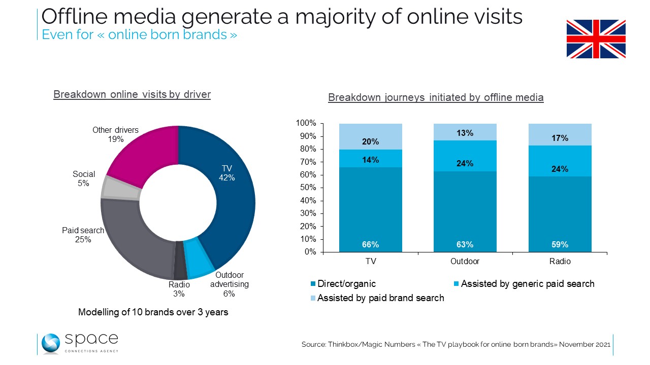 Etrange équation non ? L’explication simple est qu’une étude anglaise effectuée sur un panier de 10 marques et sur trois ans a montré qu’une majorité (51%) de la fréquentation online de ces marques était directement attribuable à l’action, directe ou indirecte, de trois médias offline : la télévision pour 42%, l’affichage pour 6% et la radio pour 3%. Ces conclusions apparaissent dans une présentation intitulée “The TV playbook for online businesses” publiée en novembre et toujours visible sur le site de Thinkbox.