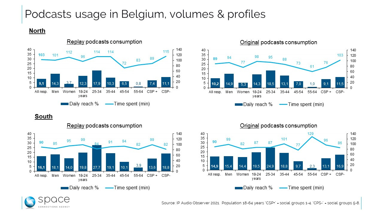 D’abord, parce qu’avec une notion d’audience journalière “daily reach”, la donnée fournie est beaucoup plus pertinente qu’une notion de consommation “au cours des derniers mois”, beaucoup plus vague. Ensuite, parce que l’étude renseigne sur les lieux de consommation : les podcasts sont plutôt consommés en out-of-home, au sport ou dans les transports en commun. Enfin parce que c’est la première fois en Belgique qu’on parle non seulement de pénétration du podcast, mais aussi du temps d’écoute. C’est ainsi qu’on apprend que la durée de consommation est de l’ordre d’une heure et demie, avec des variations suivant les segments de population : au minimum une heure par jour, au maximum deux, chez les consommateurs de podcasts.