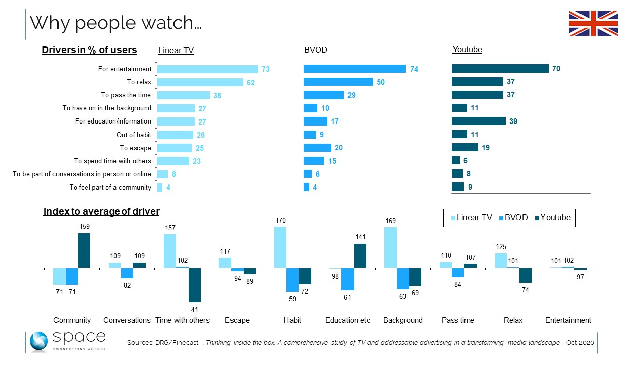 Pourquoi regarder la TV aujourd’hui plutôt que ses concurrentes délinéarisées et adaptées à nos besoins ? Investiguer les motivations qu’expriment les consommateurs par rapport à différentes offres vidéo, en incluant évidemment celle, traditionnelle, de la télévision linéaire, c’est l’objectif d’une ambitieuse étude publiée en octobre dernier par Finecast (WPP) au Royaume-Uni.