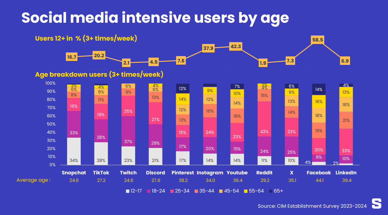 Entre autres dispositions, la nouvelle convention bannit tout simplement la pub pour les boissons alcoolisées sur TikTok et Snapchat pour cause de filtrage d’âge déficient. Ceci nous donne l’occasion d’examiner le profil par âge des utilisateurs réguliers des plateformes sociales disponibles dans la plus récente Establishment Survey du CIM (terrain d’avril 2023 à mars 2024 sur plus de 6.300 individus).