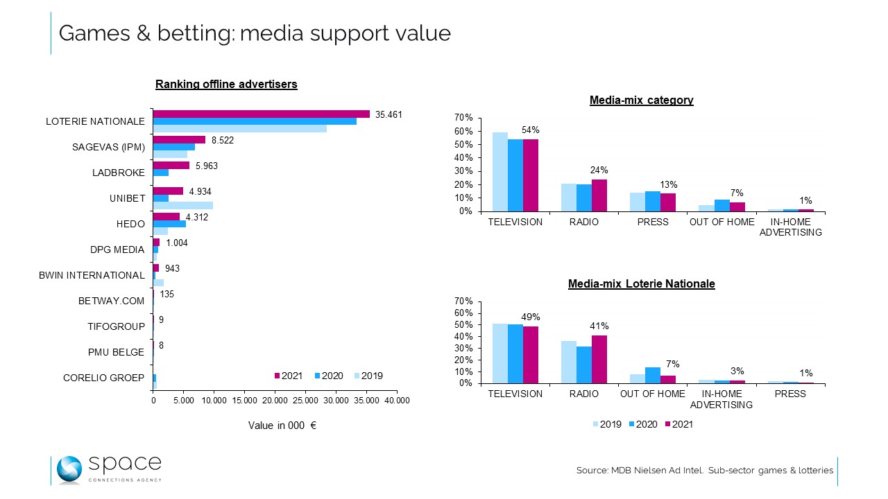 L’ensemble du secteur pesait un peu plus de 61 millions d’euros en valeur brute tarif en 2021, en hausse de 18% par rapport à 2020, qui elle-même avait fait 6% de mieux qu’en 2019 (dans un marché en récession, rappelons-le). Il est intéressant de découvrir deux groupes médias, IPM et DPG, parmi les annonceurs impliqués, l’un pour Unibet, l’autre pour une petite série de marques de paris sportifs liés au foot et au cyclisme. Mais au-delà de cela, on constate aussi que le plus gros acteur de la catégorie est l’Etat fédéral lui-même, à hauteur de 60% sur les trois années considérées. Apparemment, le projet d’arrêté royal exempterait justement la Loterie Nationale, à l’exception du produit Scooore!, qui de de toute façon n’avait rien communiqué en offline depuis 2019.