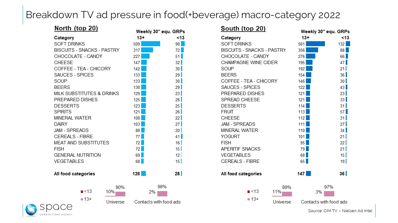 De manière générale, la frange la plus jeune représente de 10 à 11% du total selon qu’on considère le Nord ou le Sud du pays. Or, si on dissèque l’ensemble des contacts publicitaires réalisés en 2022 par les différentes catégories “alimentation-boissons”, ceux enregistrés auprès des moins de 13 ans ne représentent que 2 à 3% de l’ensemble des “impacts”.