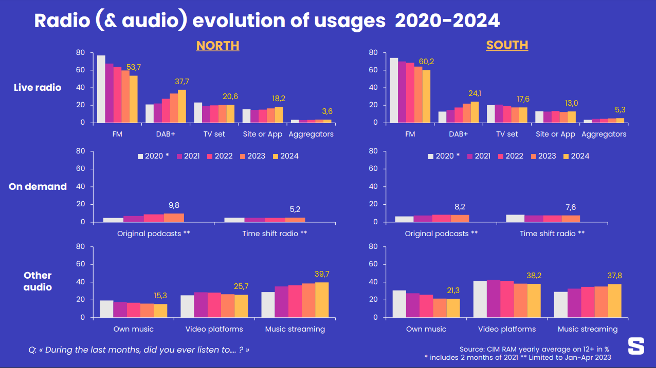 En radio, l’écoute live domine encore largement les usages. Avec une palette de plateformes différentes, mais où l’antique FM – technologie analogique pourtant décriée aujourd’hui – reste assez largement dominante.