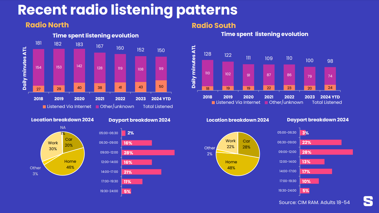 Autre aspect fondamental : l’écoute par tranche horaire. Bien sûr, le “morning peak”, que nous avons situé de 6h30 à 9h le matin, génère un fort engouement. Mais avec 28% du temps total journalier passé à écouter la radio, la tranche 10h-12h affiche un poids disproportionné : en effet, cette plage horaire ne représente finalement que 12,5% (1/8 si on préfère) de la durée totale d’une journée sur terre. Rien de nouveau ici, mais comme pour l’écoute en voiture, cela valait la peine d’être rappelé.