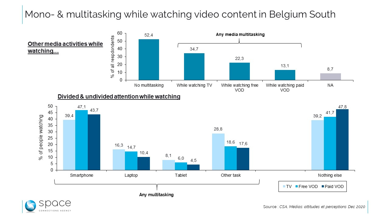 Les chercheurs du CSA expliquent cette moindre fréquence de multitasking média par les démarches plus actives qu’impliquent les plateformes de VOD, qui du coup commanderaient une attention plus dédiée. A la question « En règle générale, en même temps que vous regardez la télévision/VOD gratuite/VOD payante chez vous, vous… », c’est la modalité de réponse « vous utilisez votre smartphone » qui recueille la plus haute fréquence, devant les autres appareils proposés, ordinateur portable ou tablette. Mais l’utilisation de ceux-ci s’avère moins fréquente que la pratique « d’autres activités » dont le détail n’est pas précisé, mais qui ne sont donc pas nécessairement des consommations de médias. Plus loin, lorsqu’on détaille l’utilisation des appareils, c’est la modalité « surfer sur les réseaux sociaux » qui constitue de loin l’option la plus courante, devant le surf sur Internet et les jeux. On notera aussi que la quatrième activité la plus souvent déclarée en parallèle à une consommation vidéo, c’est « travailler », et cela concerne une réponse sur cinq environ : le multitasking est vraiment une notion large.