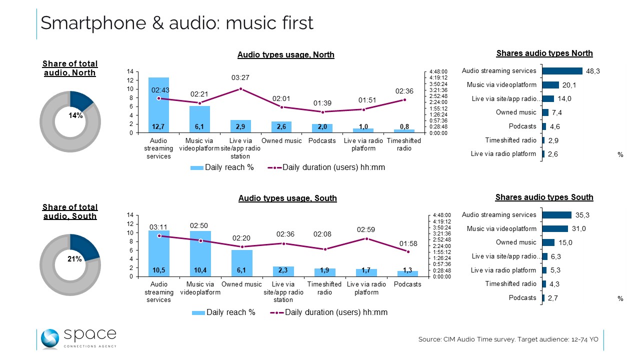 En fait le gros de la consommation audio via téléphone, c’est la musique. Si on consolide le streaming, la musique via plateforme (YouTube & co) et celle que les consommateurs disent avoir « téléchargée ou achetée », on couvre 75% du temps audio en Flandre et 80% côté Sud. Alors, oui pour être précis, les services de streaming audio évoqués à titre d’exemple dans le questionnaire (Spotify, Deezer, YouTube Music, Soundcloud, etc.) peuvent proposer autre chose que de la musique, et notamment des podcasts. Mais ces derniers font l’objet d’une rubrique à part, et sont donc en principe logés sous cette enseigne. Bref, l’audio via smartphone, en-dehors évidemment des fonctions de base, comme les conversations téléphoniques, c’est en grande partie de la musique, quel que soit le côté de la frontière linguistique où l’on se place.