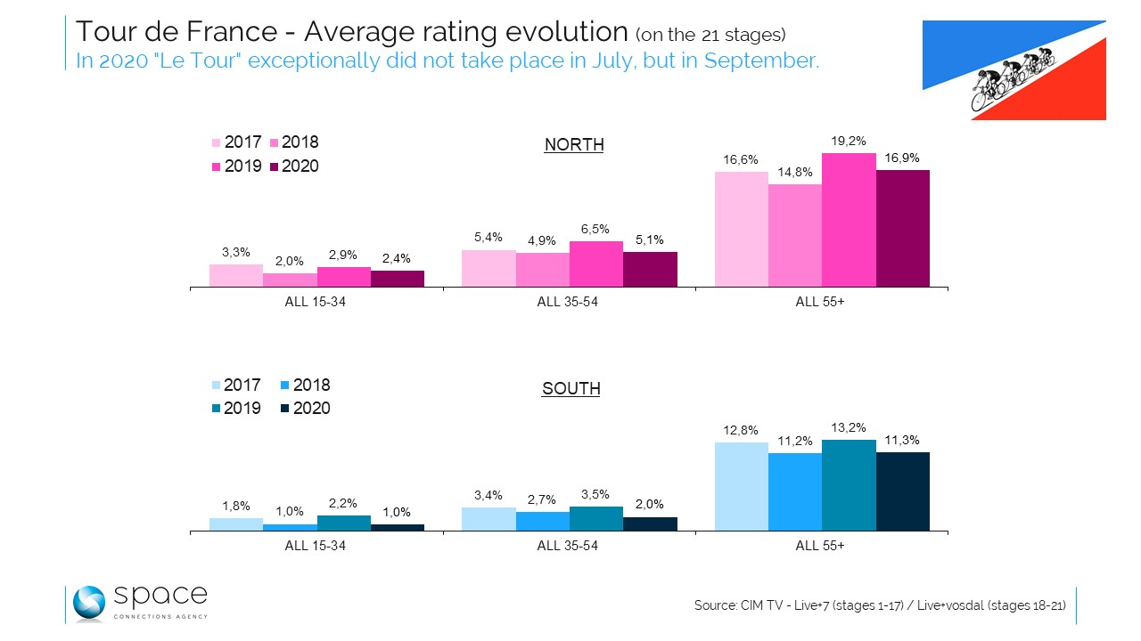 La vision différée notamment, outil de rattrapage par excellence, est restée très faible, comme traditionnellement sur ce genre d’événement. Il ne faut évidemment voir là qu’un accident dû à cet agenda inédit : les audiences réalisées l’année passée sont là pour le prouver. L’intérêt des francophones n’a pas fondu en 13 mois. Gageons que le Tour 2021, verra tout rentrer dans l’ordre, en espérant évidemment qu’il revienne dans sa configuration traditionnelle. Entre des audiences correctes, mais un peu faibles dans le Nord, et des audiences décevantes dans le Sud, il semble évident qu’on ne bouscule pas la tradition et les habitudes sans conséquence. Ainsi, déplacé dans une période pourtant hors vacances et bénéficiant d’une audience Total TV plus élevée, le Tour n’a pas vraiment donné tout son potentiel en TV cette année globalement très atypique il va sans dire.