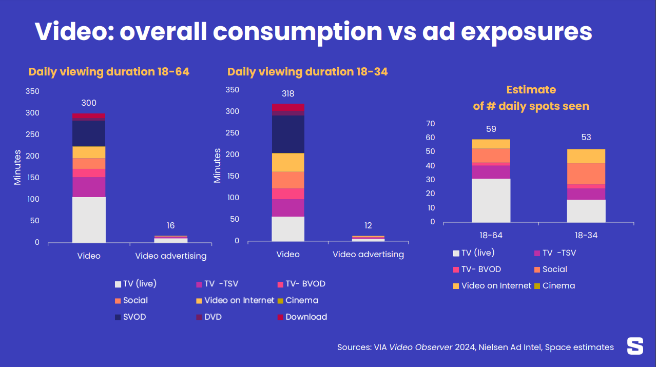 Video Observer estime en effet des durées d’exposition publicitaire par canal : pour l’ensemble des répondants, un total de 16 minutes par jour, dont 10 en TV linéaire ou 1 sur les médias sociaux. En partant de ces durées, divisées par la longueur moyenne d’une vidéo publicitaire (20 secondes en télévision, 35 en cinéma, données basées sur les statistiques Nielsen, et une estimation faite à 6 secondes en social et 10 en vidéo en ligne), on obtient une valeur de 59 expositions par jour pour la population générale (18-64 ans) et 53 par jour pour les 18-34 ans. Bien sûr on n’a ici qu’une partie de l’exposition publicitaire totale, mais c’est un progrès.