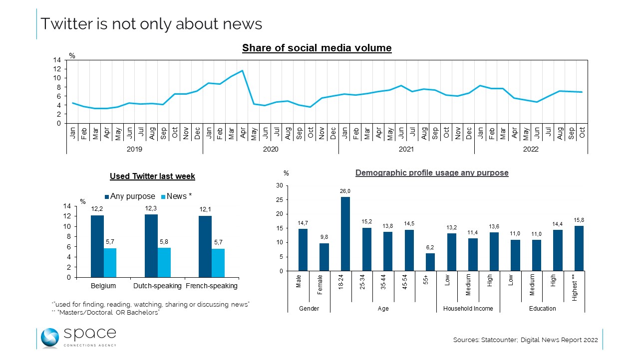 Ce même DNR apporte aussi un paradoxe : près de la moitié des utilisateurs de Twitter n’y recherche pas de l’information. En effet, si le réseau affiche un reach hebdomadaire de l’ordre de 12% sur la population générale, on tombe à 6% pour ce qui touche à l’information, vue de façon large (“finding, reading, watching, sharing or discussing news”). Sans différence entre francophones et néerlandophones : les résultats y sont pratiquement identiques. Pour le reste, Twitter est un canal à l’audience limitée, plutôt fréquenté par des moins de 25 ans, mais encore sélectif jusqu’à 45, et par des personnes bénéficiant plutôt de niveaux d’instruction élevés. Des caractéristiques qu’on retrouve aussi bien dans les données Reuters que dans les toutes nouvelles informations disponibles via l’Establishment Survey du CIM.