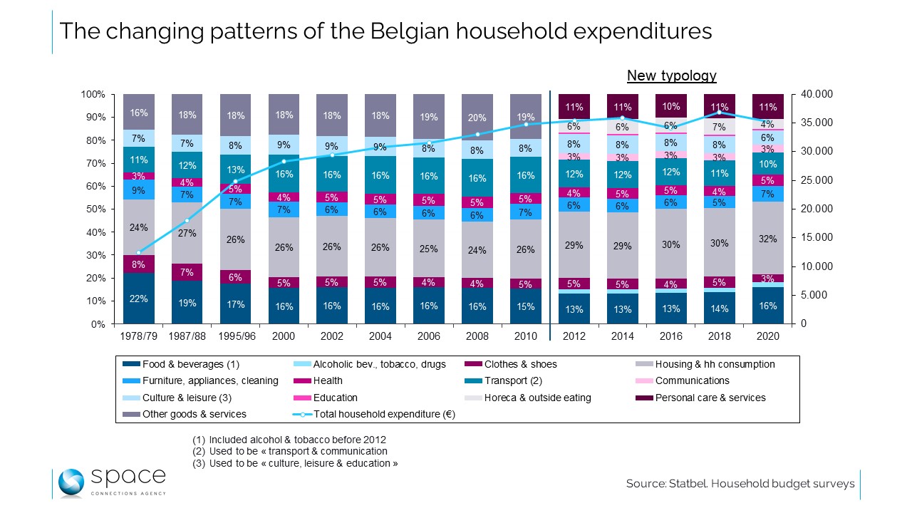 En plus grand angle, en cette année 2020, le logement et la consommation qui y est liée n’auront jamais pesé autant dans la balance globale des dépenses… et le transport aussi peu. Vous avez dit lockdown ? La seule surprise tient aux dépenses de santé, qui restent conformes en part à ce qu’elles étaient auparavant… Maintenant, vu le caractère exceptionnel de la situation mesurée l’année dernière, il est sans doute préférable de se référer à 2018 pour avoir une idée des patterns “normaux” de consommation en Belgique. C’est un des avantages de cette source.