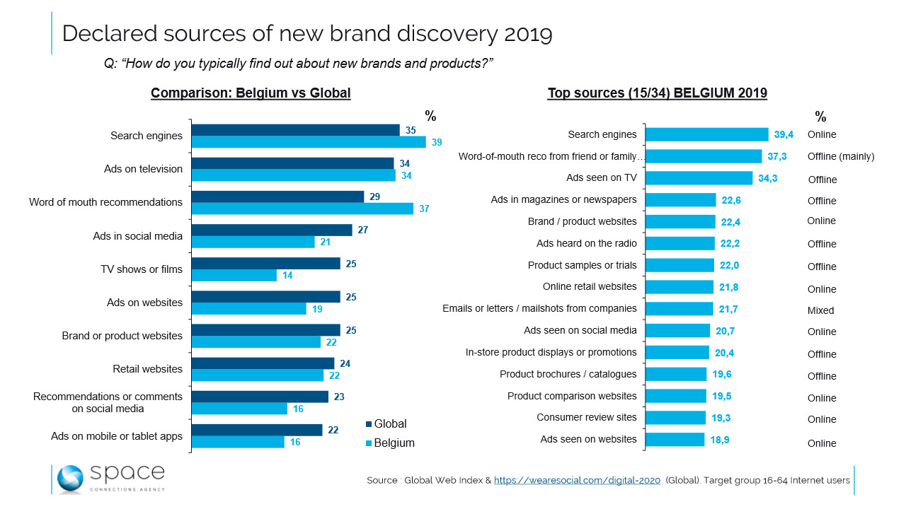 « Comment vous informez-vous habituellement sur de nouvelles marques ou de nouveaux produits ? » Cette question est posée depuis plusieurs années dans l’enquête Global Web Index (GWI), notamment en Belgique. Précision importante : on parle ici d’une étude réalisée uniquement en ligne, auprès d’une population connectée de 16 à 64 ans.