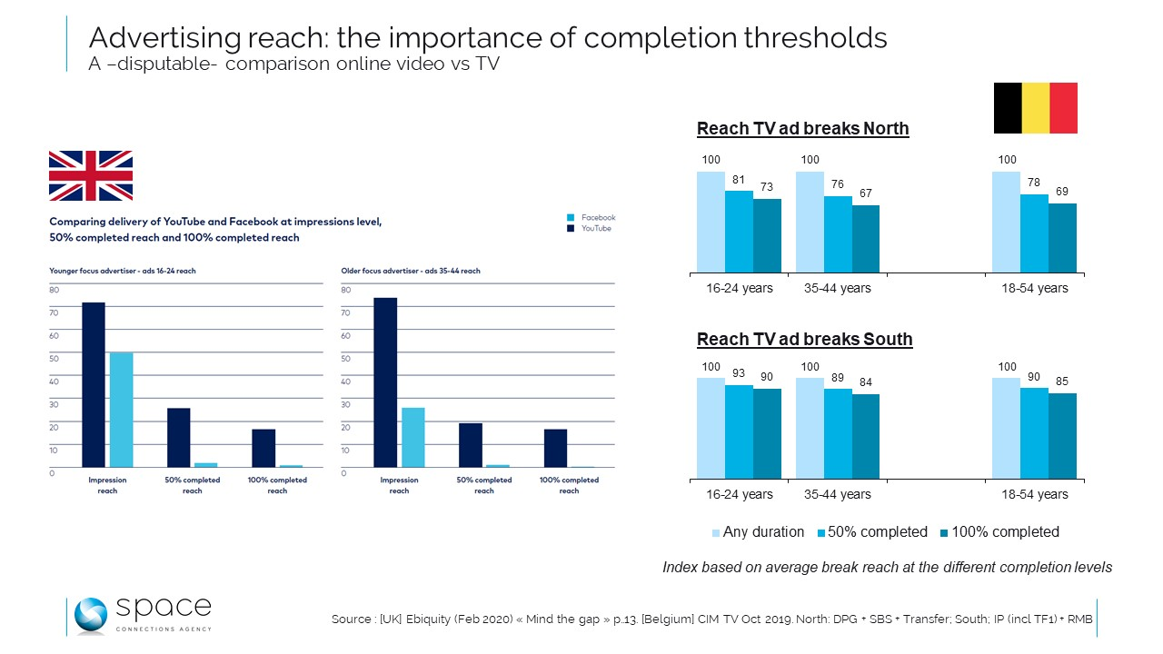 Notre comparaison est discutable sur plusieurs points, mais elle a un mérite : par rapport à la vidéo en ligne, elle souligne l’importance du seuil de vision. Terminons en soulignant qu’Ebiquity plaide en faveur d’un seuil de vision à 50%, précisément celui des rapports de performance TV en Belgique et celui que Space a appliqué lorsque nous avons lancé le Cost Per Effective View pour la vidéo en ligne.