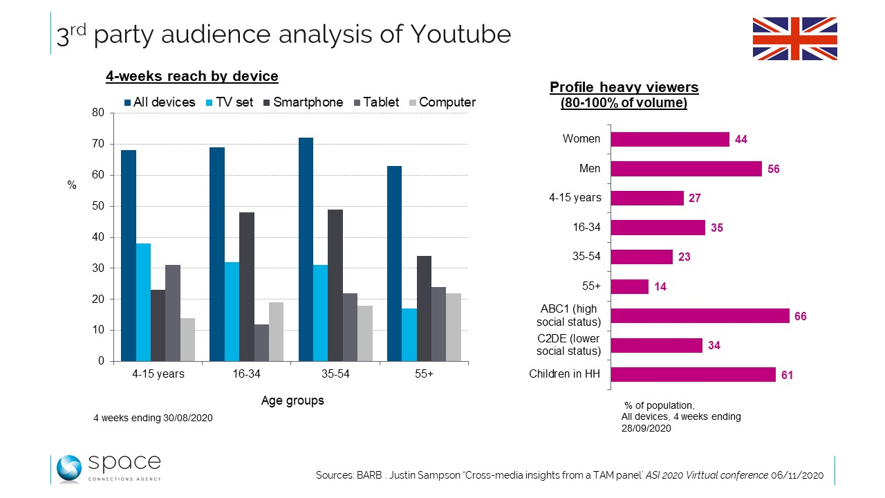 L’une de ces interventions émanait du BARB, le Joint Industry Committee en charge de la mesure d’audience TV au Royaume-Uni. Et que contenait-elle ? notamment des courbes d’audience assez classiques lorsqu’il s’agit d’audimétrie. Sauf qu’il s’agissait ici de YouTube, Netflix ou encore Disney+. Bref de la SVOD, rapportée comme de la TV classique par le même outil de mesure que celui de la TV classique. L’orateur, Justin Sampson, CEO du BARB, s’est attardé plus longuement sur YouTube, montrant notamment des données d’audience par device et par tranche d’âge. Ainsi que d’autres, notamment le profil du quintile supérieur de vision de YouTube : une empreinte assez prévisible pour ces heavy viewers de YouTube, puisque plutôt masculine, jeune adulte, socialement favorisée.