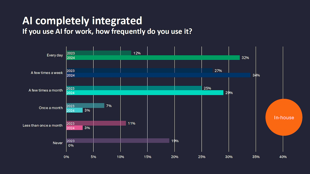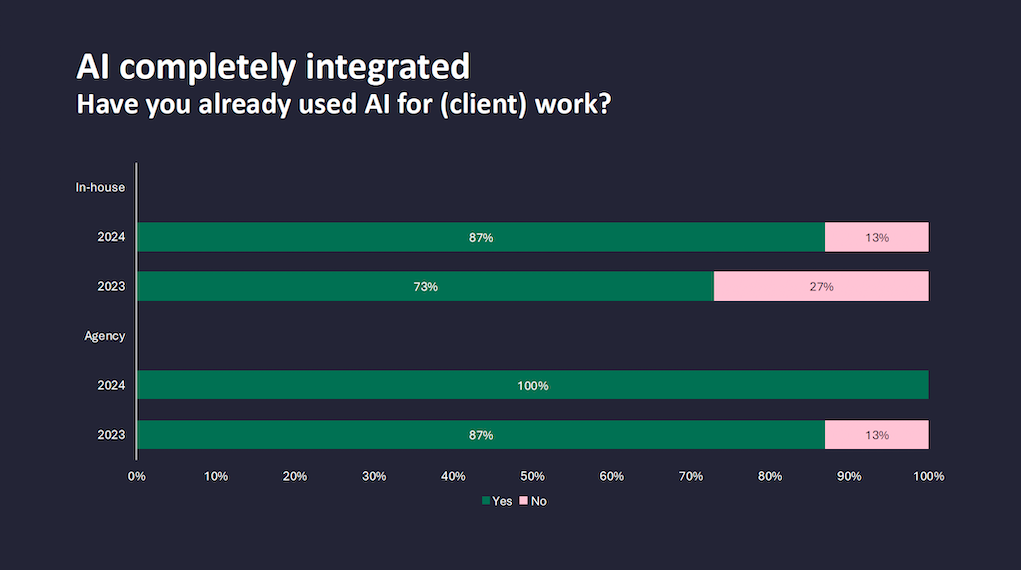 Par ailleurs, tant les conseillers en communication que les entreprises dotées de services de communication interne adoptent des règles de plus en plus strictes concernant l’usage de l’IA. Ce sont les principales conclusions de la deuxième enquête sur l’IA menée par C Square. Un autre résultat marquant : aucun répondant ne craint que l’IA ne remplace son poste.