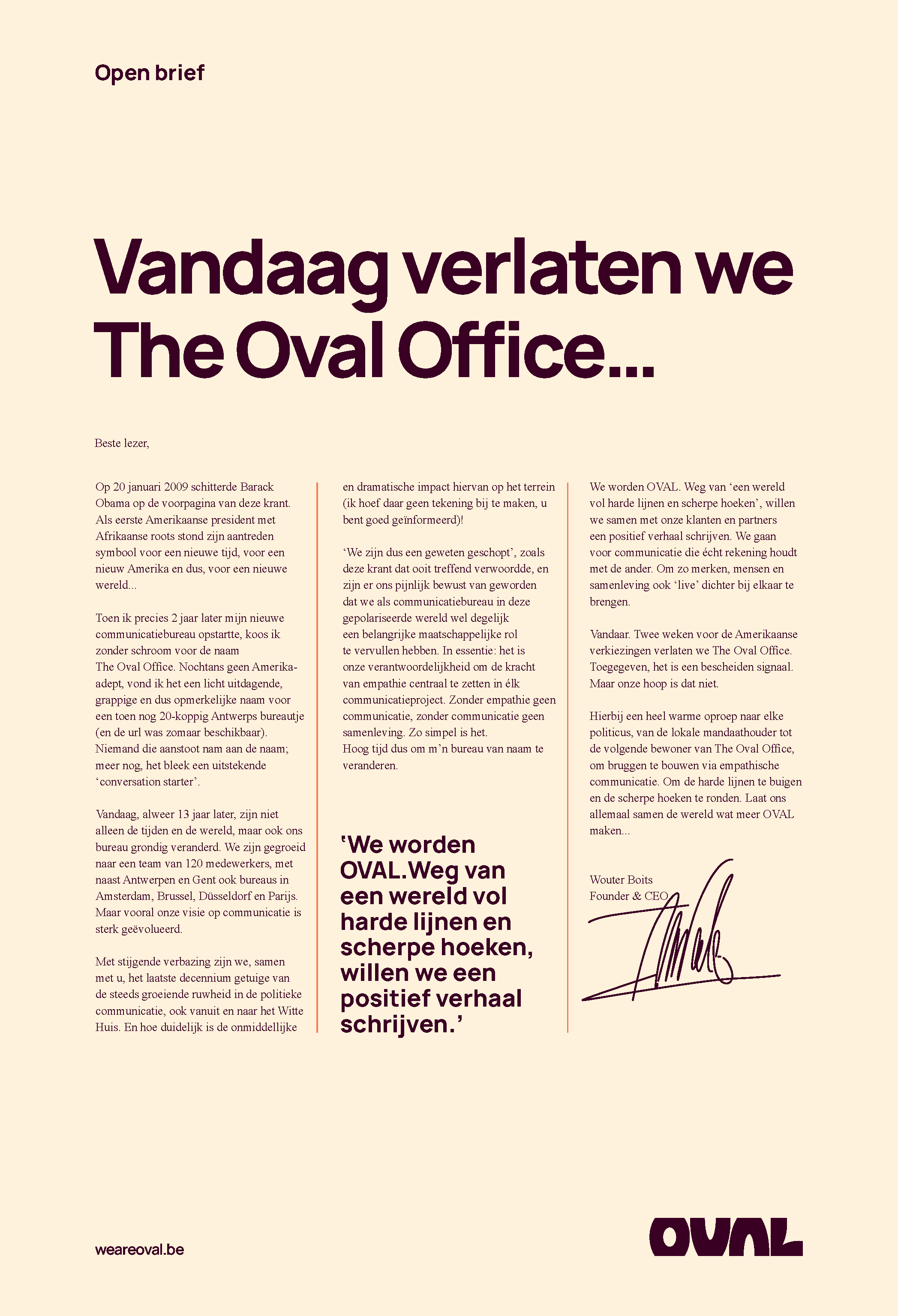 C’est par une pleine page de publicité dans les quotidiens que Wouter Boits annonce son changement de nom. L’agence créative, spécialisée dans les expériences de marque, s’engage résolument dans la connexion. Sa nouvelle identité en témoigne : à partir du 15 octobre, The Oval Office poursuivra ses activités sous le nom d’OVAL.