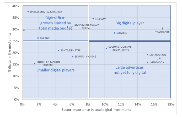 Le rapport UMA démontre, comme on pouvait s’y attendre, que les principaux acteurs du média digital sont les annonceurs appartenant aux secteurs des transports (incl. Automobile, compagnies aériennes…), des services (incl. Services financiers, assurances…) et des télécoms. Ces groupes économiques consacrent une part de leurs investissements médias plus importante que la moyenne aux canaux digitaux. D’autres secteurs investissent une forte proportion de leur budget dans les médias digitaux (habillement), mais les limites de leur budget média total, réduisent leur impact sur le marché digital.