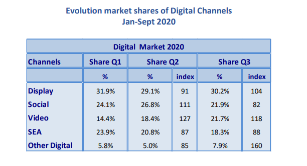 ‘Display’ repasse au-dessus des 30% des investissements et reste leader, ‘Social’ reste deuxième malgré un recul de 18% de sa part de marché et ‘Video’ continue sa remarquable progression en dépassant ainsi ‘SEA’.