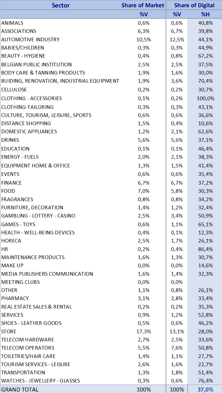 • En général, la part de la publicité digitale dans le total de l’investissement se situe à 37%, contre 34% il y a un an.
