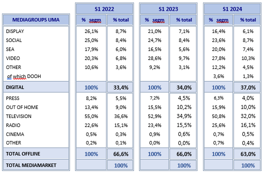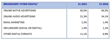 Innovation pour ce premier semestre 2024 : les données relatives au Digital Out Of Home (DOOH), réservé de façon directe ou par programmatique, sont disponibles à part. Pour maintenir l’historicité, ces données sont également incluses dans le « other digital », de façon à permettre les comparaisons avec le passé.