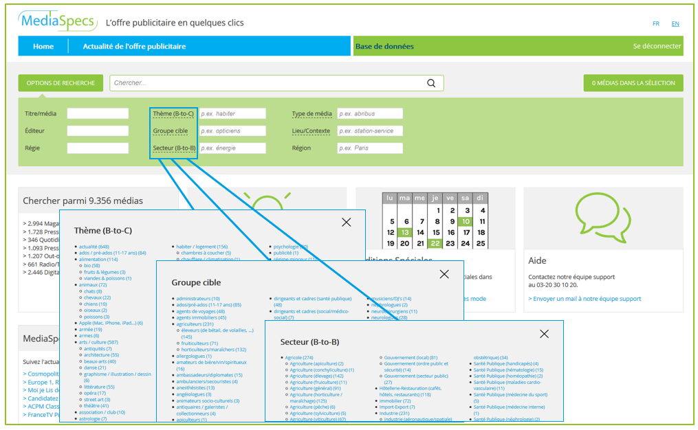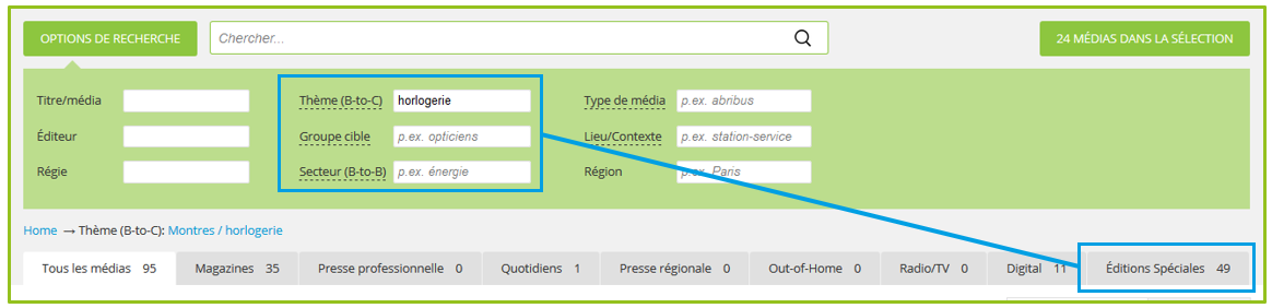 Avec MediaSpecs, vous pouvez chercher dans plus de 2.000 éditions spéciales. En effet, dans notre moteur de recherche apparaissent aussi les dossiers et thèmes rédactionnels annoncés par les régies/éditeurs dans leurs kits média.